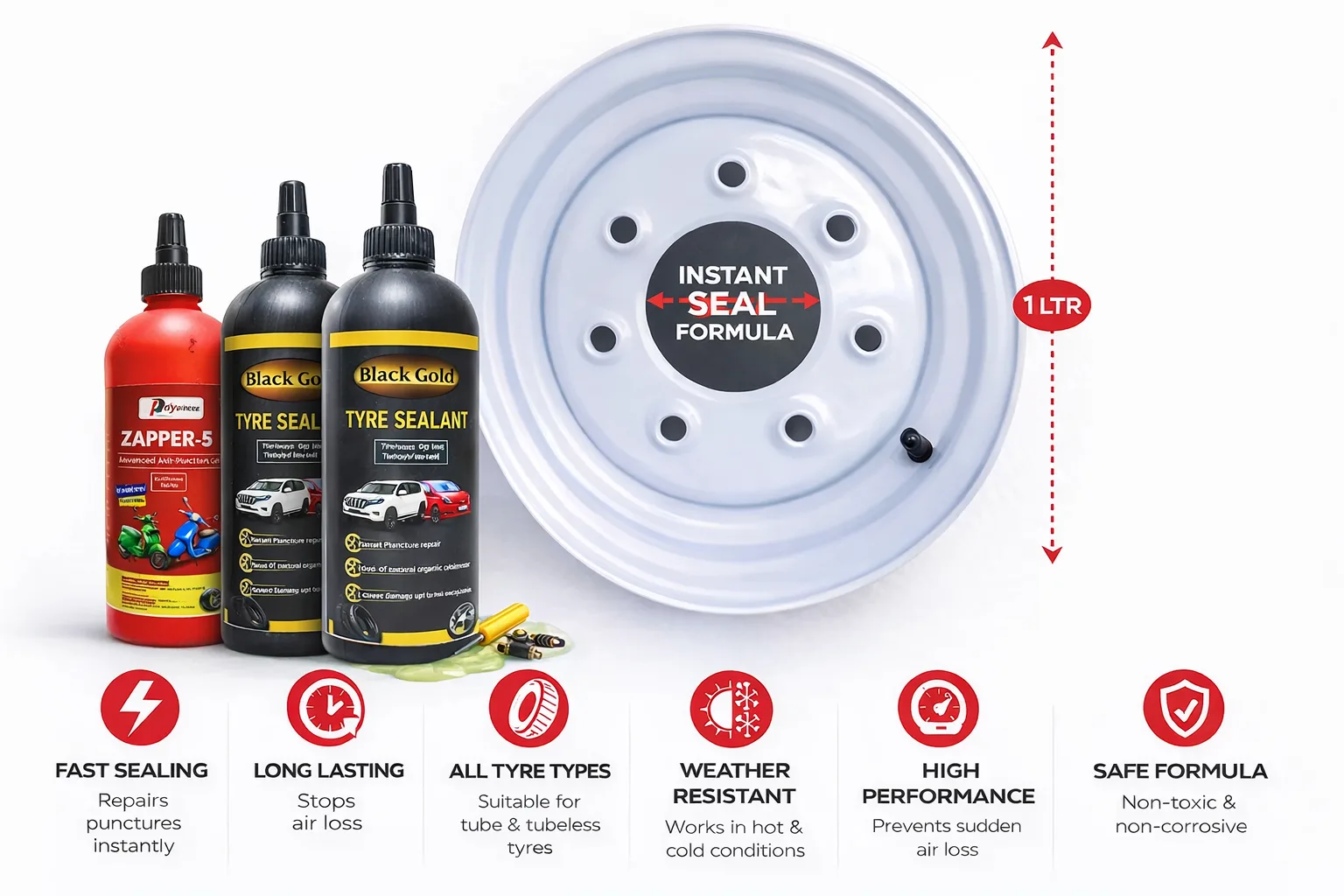 Our specially tested sealant works silently inside your tyres, sealing punctures instantly and preventing dangerous air leaks. From city commutes to long highway drives, it ensures your tyres remain safe, durable, and road-ready.